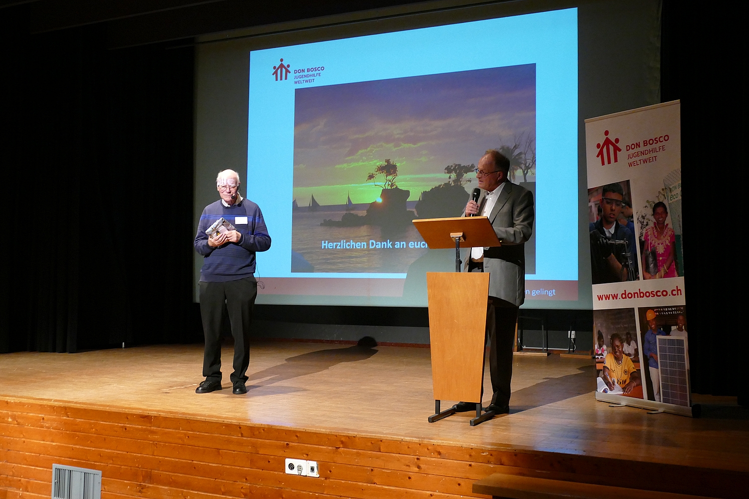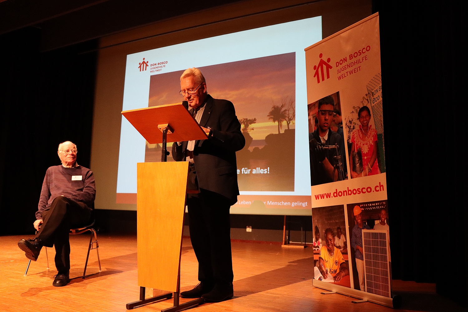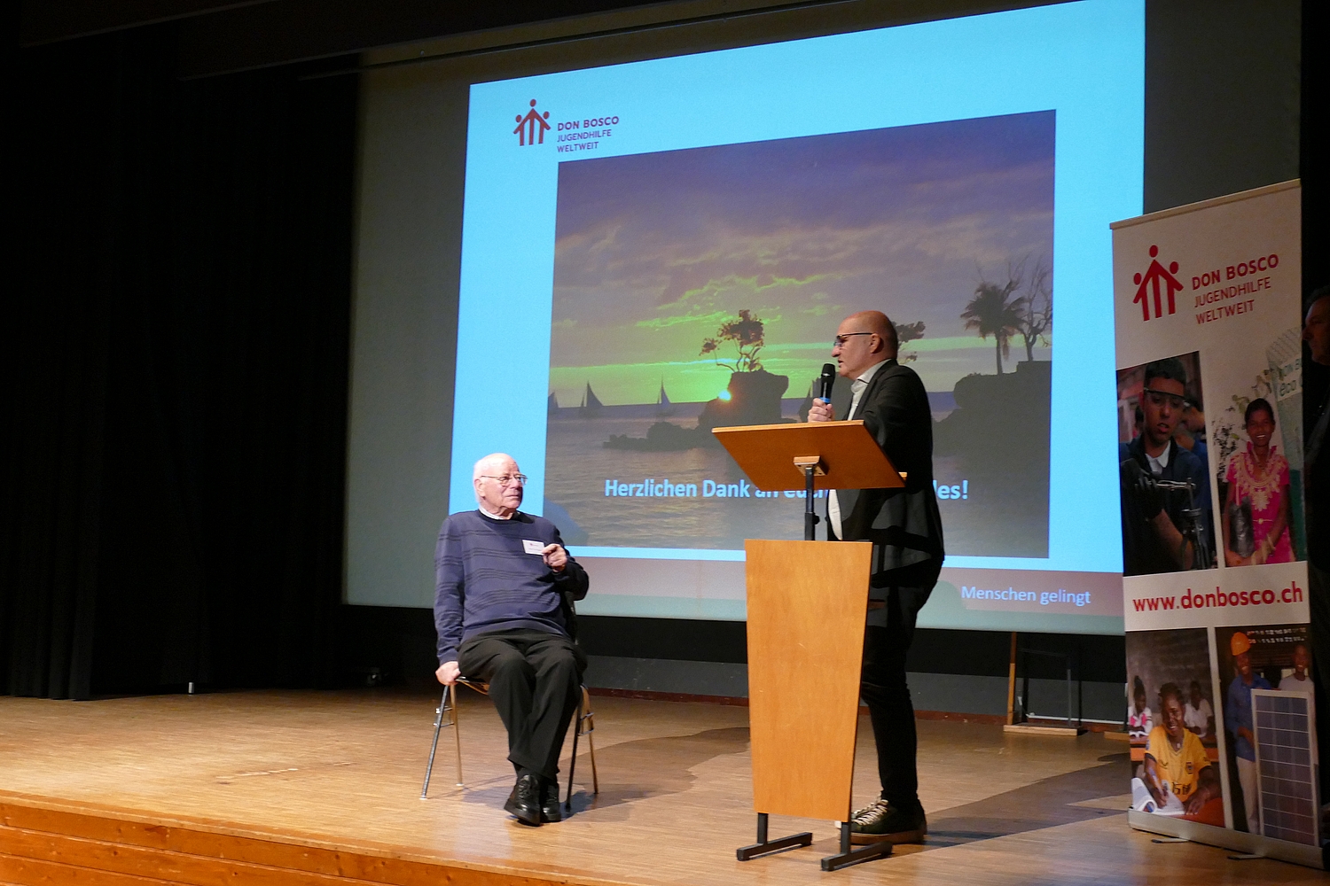 In einer feierlichen und berührenden Zeremonie im Theatersaal des Don Boscos in Beromünster kamen am 21. Oktober zahlreiche Weggefährt/innen, Spender/innen sowie Freund/innen zusammen, um Pater Rogger für sein unermüdliches Engagement für die Jugend überall auf der Welt zu danken und zu ehren. Gemeinsam wurde auf 30 Jahre bedingungsloses Engagement, harte wie lustige Momente zurückgeblickt. «30 Jahre habe ich dafür gearbeitet – nun ist es schön, dass ich es weitergeben kann – noch bevor ich zusammenfalle!», meinte Pater Rogger an jenem Tag.